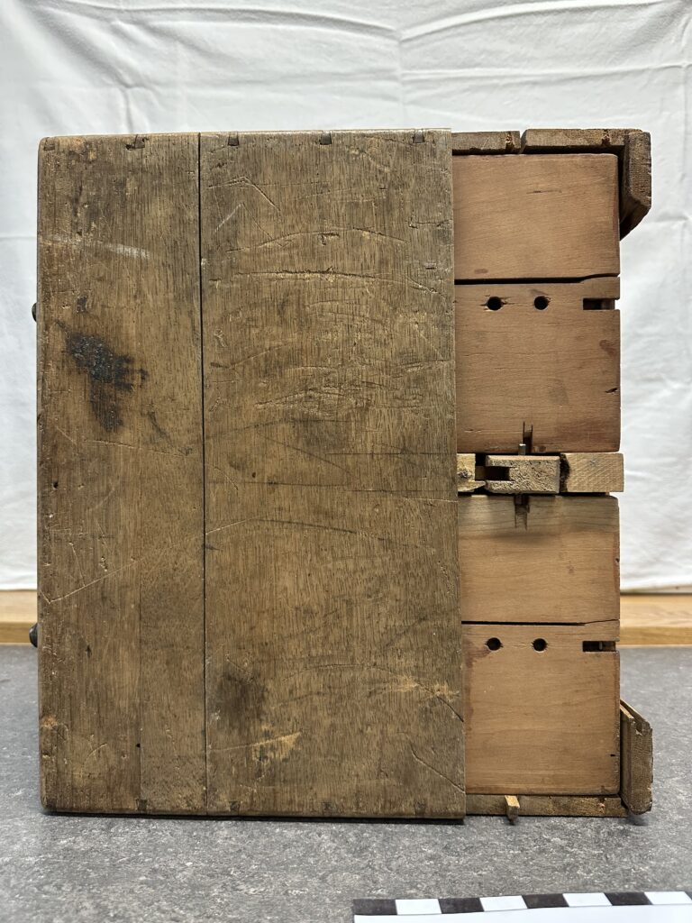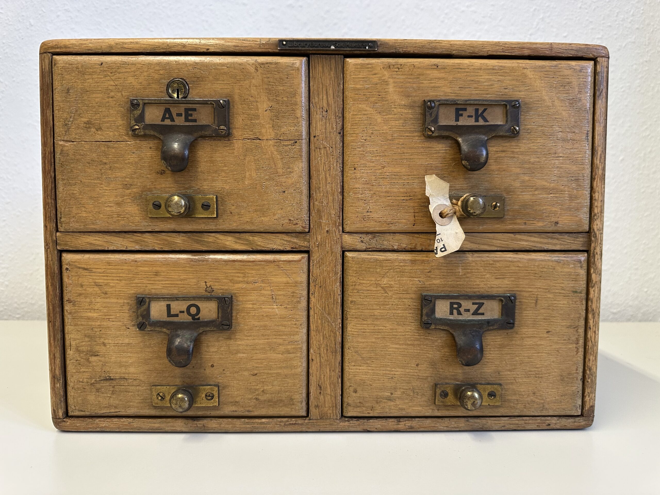 Simultan zu einer Restaurierung, im Fachbereich Papier, der Sammlung Kuczynski im Auftrag der Zentral- und Landesbibliothek Berlin zur Bestandserhaltung, wurde ebenfalls die Restaurierung dieses Archivkästchens durchgeführt. Dieses stammt aus der Werkstatt des amerikanischen Unternehmens Library Bureau und ist vermutlich in einem Zeitraum um die Jahrhundertwende des frühen 20. Jahrhunderts entstanden. Das aus Eichenholz und mit Messingbeschlägen gefertigte Kästchen fiel hier besonders durch seine Instabilität der Holzverbindungen sowie fehlender Teile im hinteren Bereichs sowie der Front auf. Da es zur Aufbewahrung der handschriftlichen Kartierung des Bibliotheksbestandes vom Stifter benutzt wurde, gehört es fest zur Sammlung. Während der Restaurierung wurden neben der Festigung der losen Holzverbindungen auch die fehlenden Teile Rekonstruiert. Zusätzlich zur Wiederherstellung der internen Verschlussmechanik wurde ebenso der fehlende Schlüssel nachgefertigt.