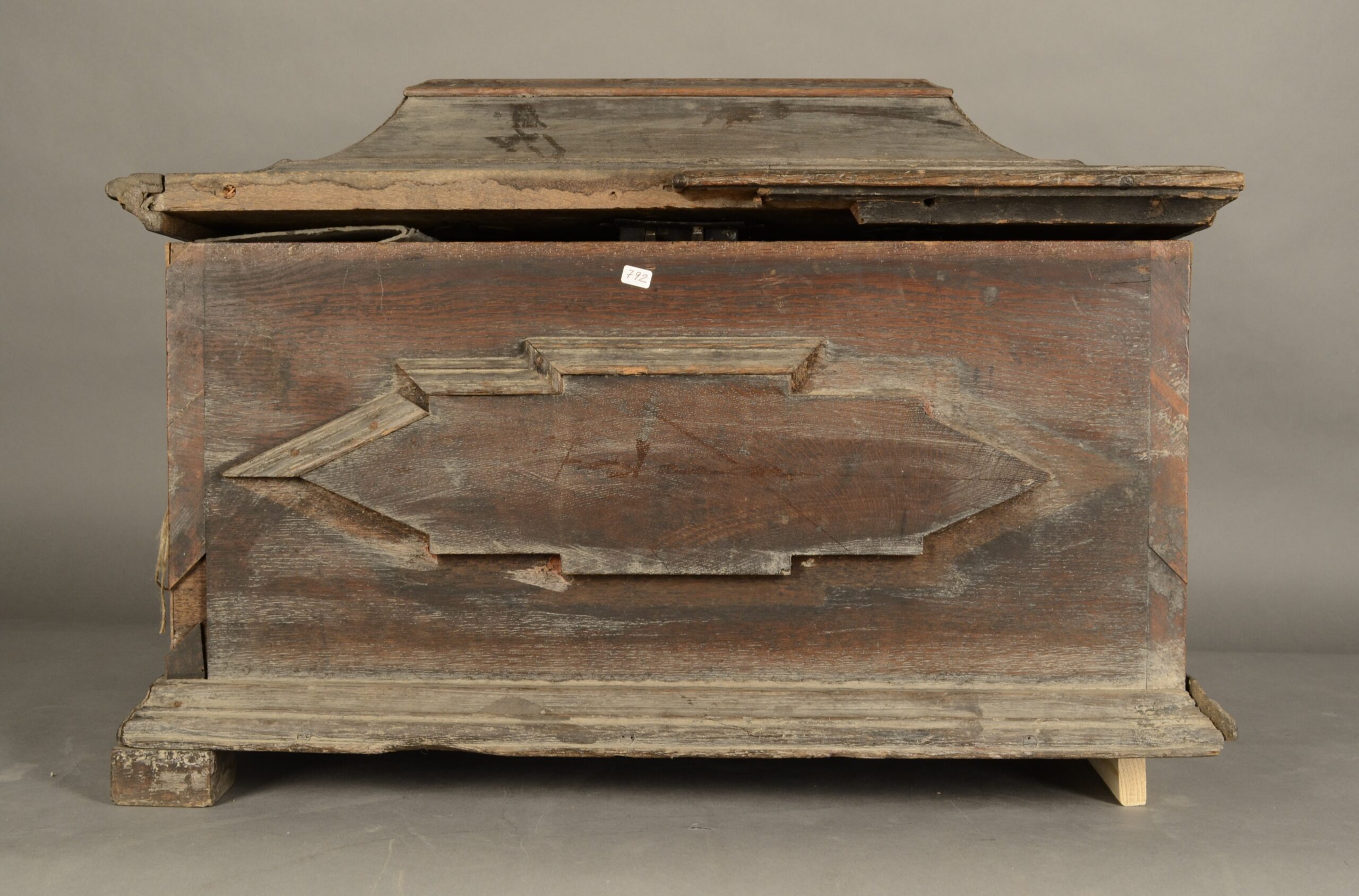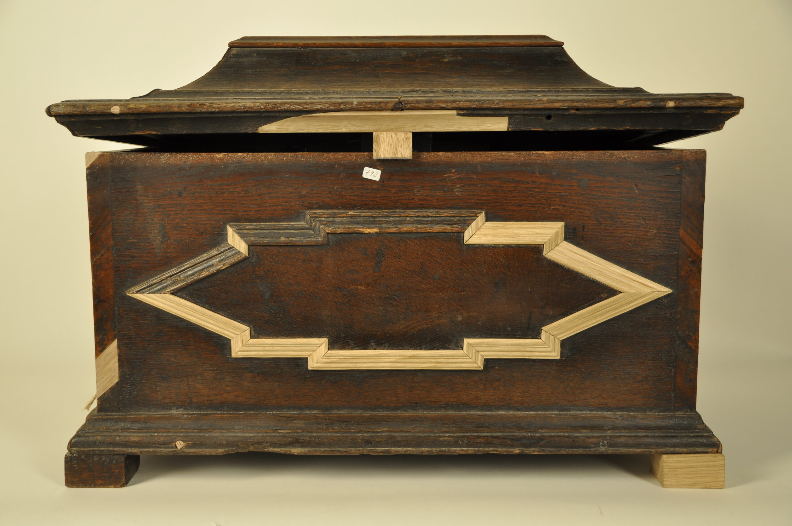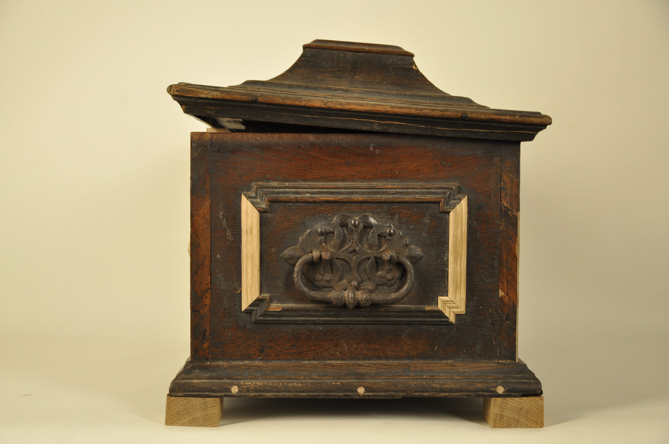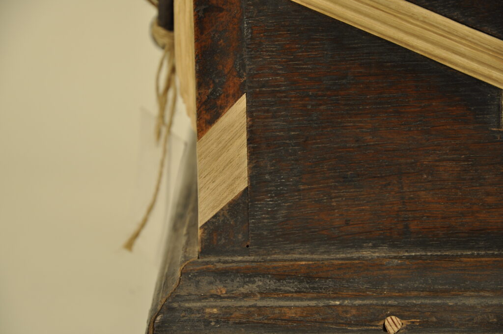 Die Zunfttruhe aus dem Besitz des Eberswalder Stadtmuseums erreichte uns in einem denkbar schlechten Zustand. Sie ist ehemals von der Eberswalder Schneiderzunft benutzt worden und höchstwahrscheinlich im Barock 1724 hergestellt worden. Ein Hinweis darauf bietet ein graviertes Abdeckblech des innen liegenden Schlosses mit zeitgenössischer Gestaltung. Mit einer krepierten Wachsoberfläche und zahlreichen fehlenden und gebrochenen Teilen war hier eine Restaurierung dringend notwendig. Im Laufe dieser wurde die Zunfttruhe strukturell wieder gefestigt und Rekonstruktionen der fehlenden Teile angefertigt um dem Objekt wieder in seiner Funktion und Aussehen entsprechend gerecht zu werden. Die krepierte Lackoberfläche konnte zum Glück ebenfalls wieder hergestellt werden wordurch die Zunfttruhe zu ihrer alten Schönheit zurückfand. Die ergänzten Teile wurden absichtlich farblich nicht retuschiert um eine klare Abgrenzung der neuen Teile im Vergleich zu den historischen Teilen zu schaffen.
