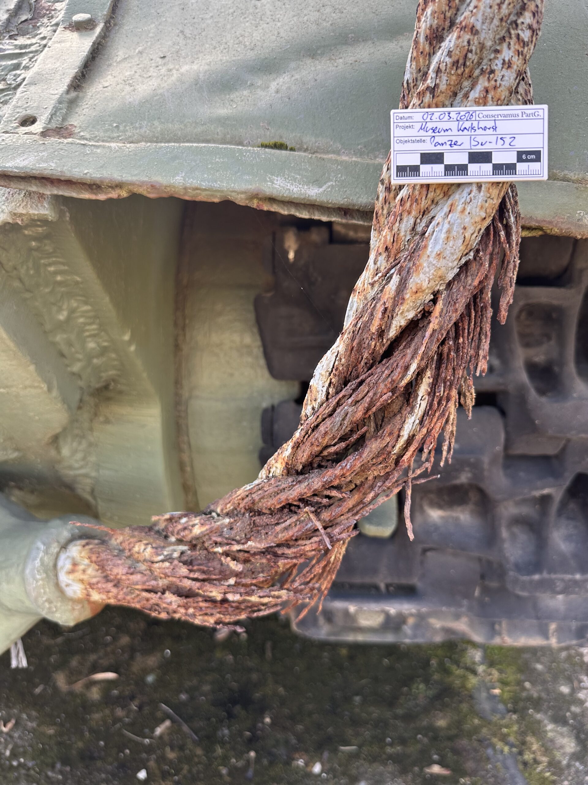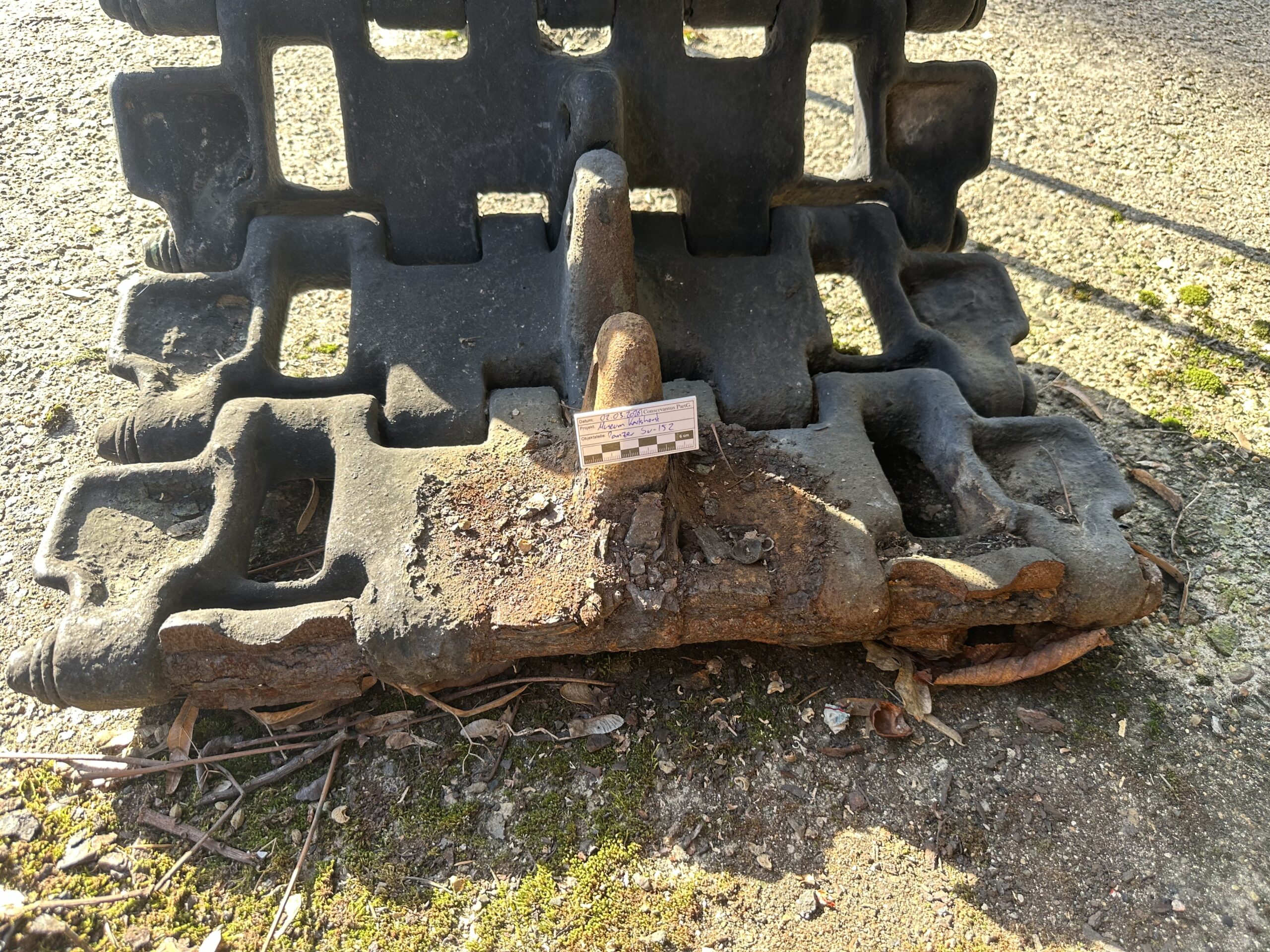 Aufgrund extrem niedriger Temperaturen und mechanischer sowie statischer Belastung ist im vergangenen Winter 25/26 die Kette eines der ausgestellten Panzer (ISU-152) im Besitz des Museums Karlshorst gerissen. Durch die jahrelange freie Bewitterung sowie extremer Lastbeanspruchungen kam es vorerst zu Rissen, Korrosionsbildung und abschließend zum Bruch der Kette. Im Laufe der Schadenserfassung wurden diese und weiter Schäden dokumentiert und in einem Gutachten zusammengefasst.